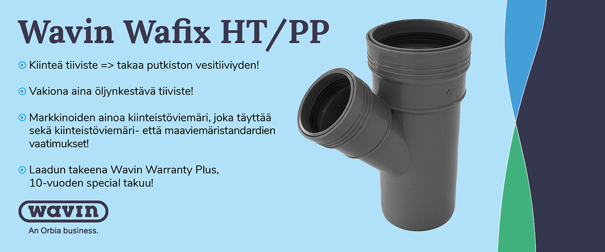 Wavin Wafix HT/PP 110 mm ja 160 mm -viemärit ovat ainoana muoviviemärinä sertifioitu sekä kiinteistöviemäriksi että maaviemäriksi. Wafix soveltuu siis käytettäväksi rakennuksen sisällä ja maahan asennettuna sekä kiinteistön alueella että sen ulkopuolella. Wafix täyttää siis käyttöalueet BD (EN 1451) sekä UD (EN 1851).