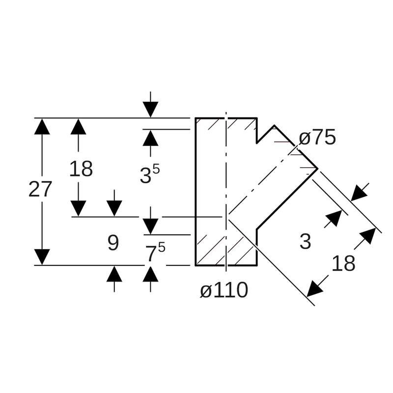 Geberit PE -haarayhde 45°: d = 110 mm, d1 = 75 mm.