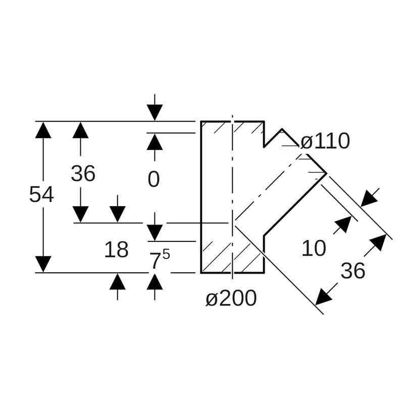Geberit PE -haarayhde 45°: d = 200 mm, d1 = 110 mm.