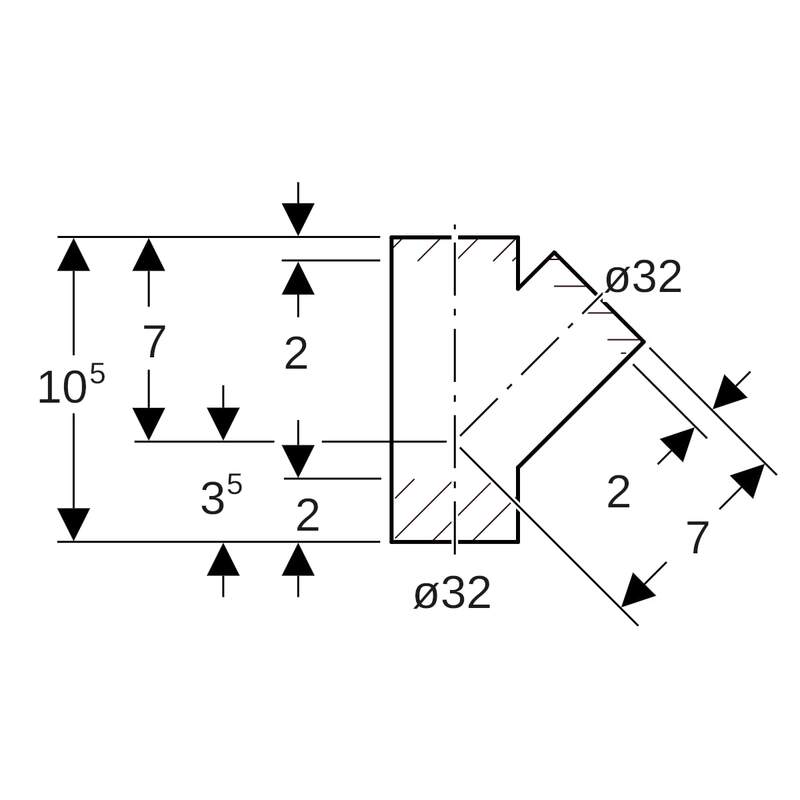 Geberit PE -haarayhde 45°: d = 32 mm, d1 = 32 mm.