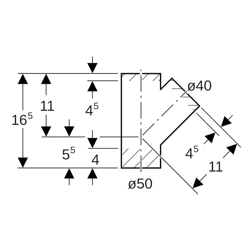 Geberit PE -haarayhde 45°: d = 50 mm, d1 = 40 mm.