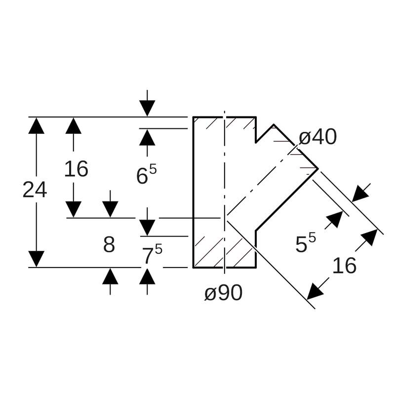 Geberit PE -haarayhde 45°: d = 90 mm, d1 = 40 mm.