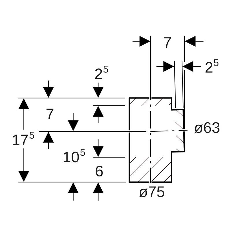 Geberit PE -haarayhde 88,5°: d = 75 mm, d1 = 63 mm.