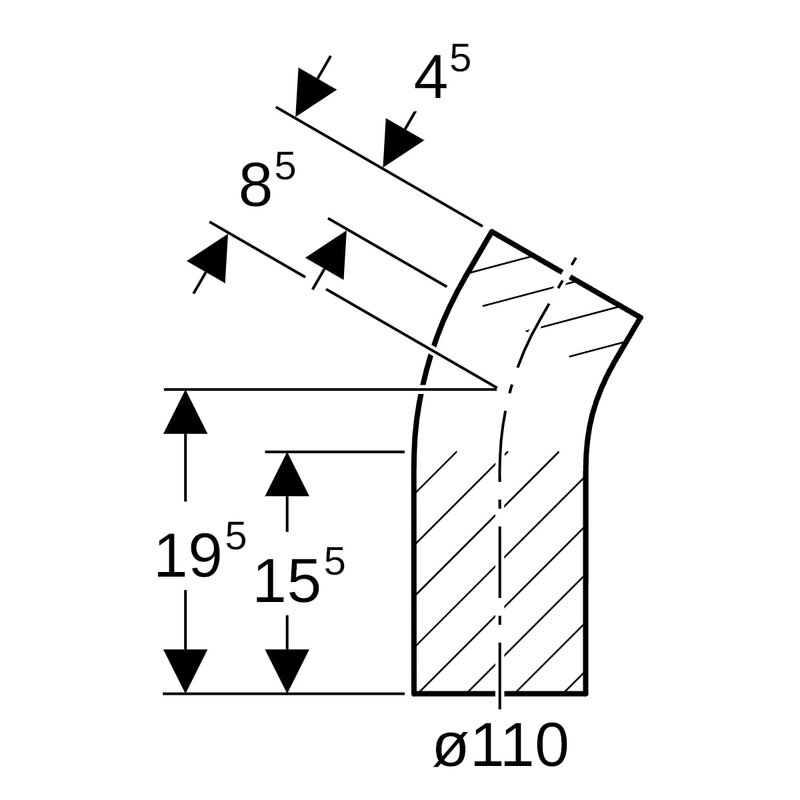 Geberit PE -kulmayhde pitkä malli: 30°, d = 110 mm.