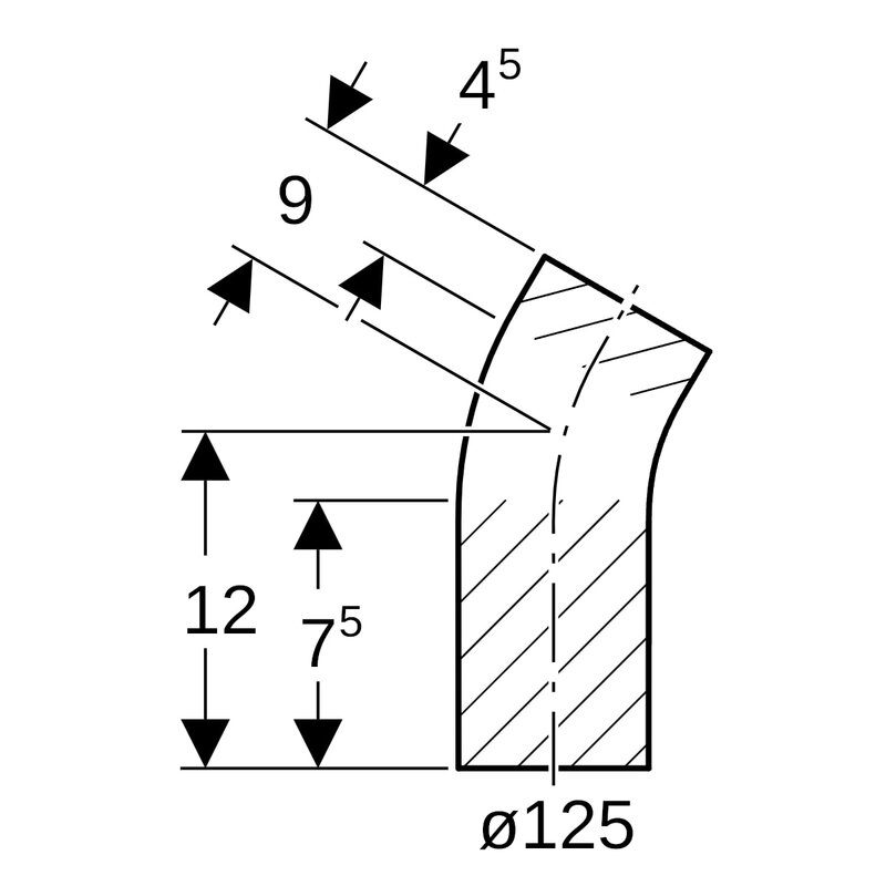 Geberit PE -kulmayhde pitkä malli: 30°, d = 125 mm.