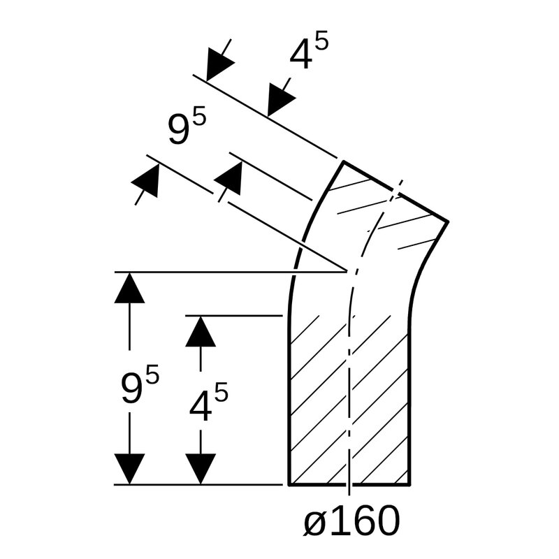 Geberit PE -kulmayhde pitkä malli: 30°, d = 160 mm.