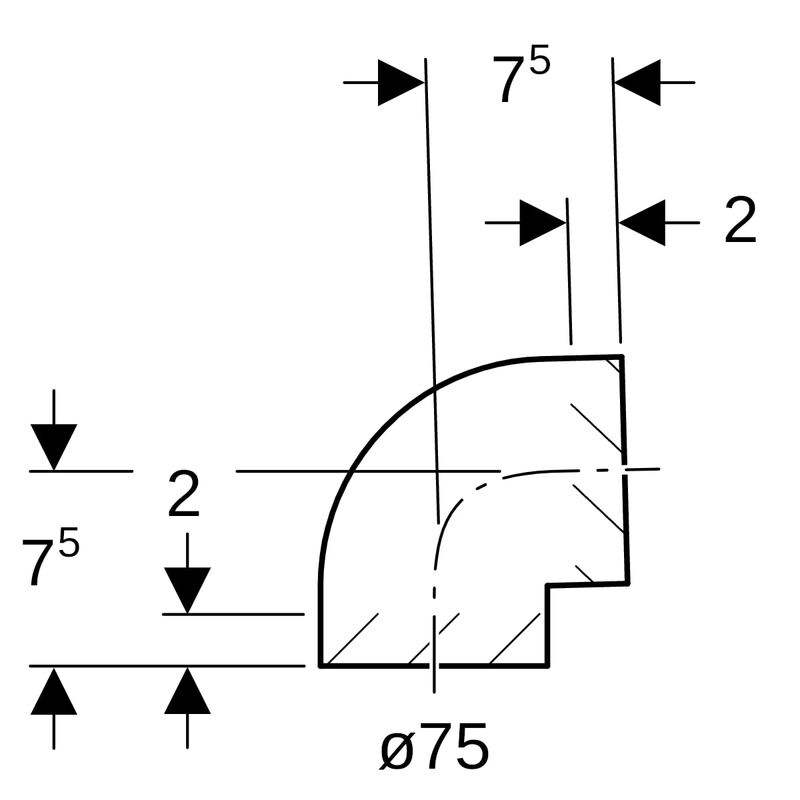 Geberit PE -kulmayhde: 88.5°, d = 75 mm.