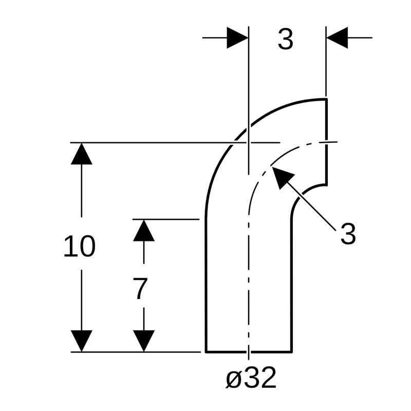 Geberit PE -kulmayhde pitkä malli: 90°, d = 32 mm.