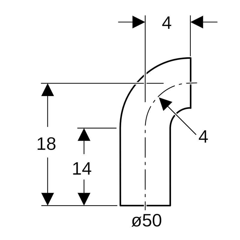 Geberit PE -kulmayhde pitkä malli: 90°, d = 50 mm.