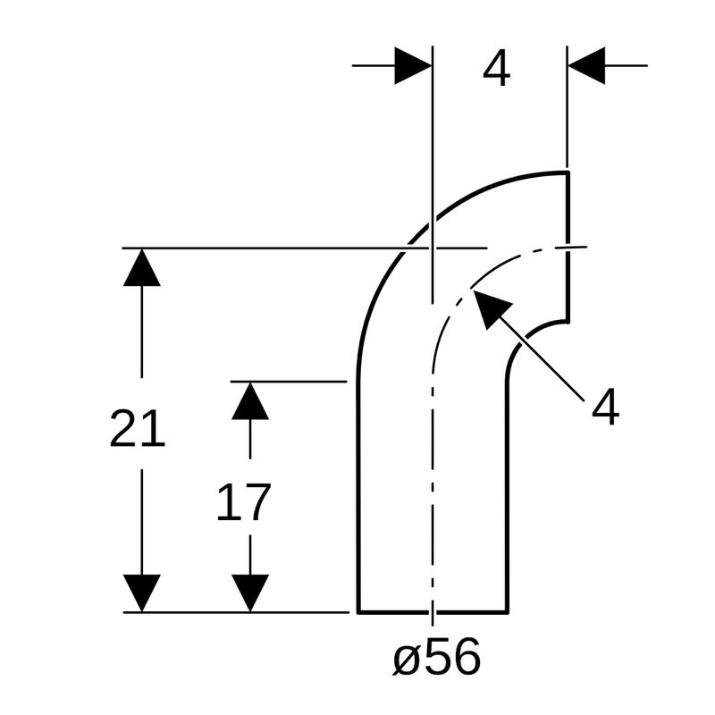 Geberit PE -kulmayhde pitkä malli: 90°, d = 56 mm.
