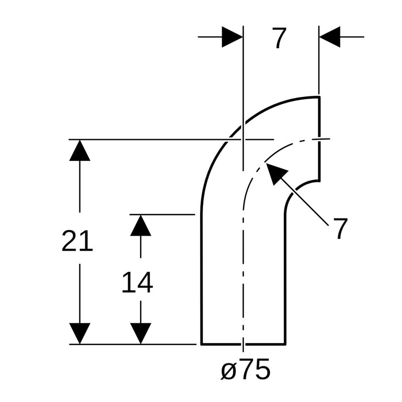 Geberit PE -kulmayhde pitkä malli: 90°, d = 75 mm.