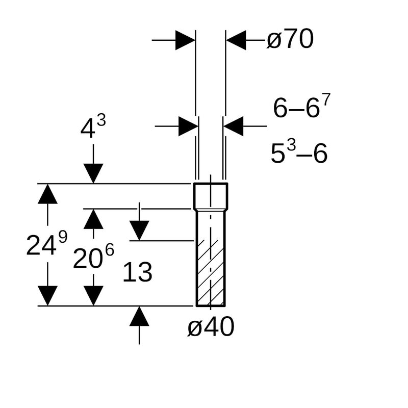 Suora Geberit PE -liitäntäyhde kutistusmuhvilla: d = 40 mm, di = 70 mm.