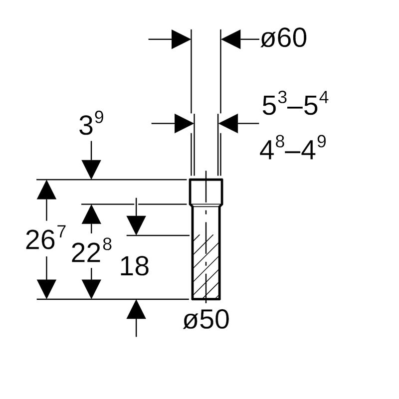 Suora Geberit PE -liitäntäyhde kutistusmuhvilla: d = 50 mm, di = 60 mm.