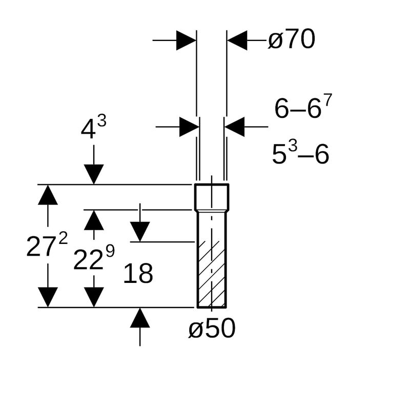 Suora Geberit PE -liitäntäyhde kutistusmuhvilla: d = 50 mm, di = 70 mm.