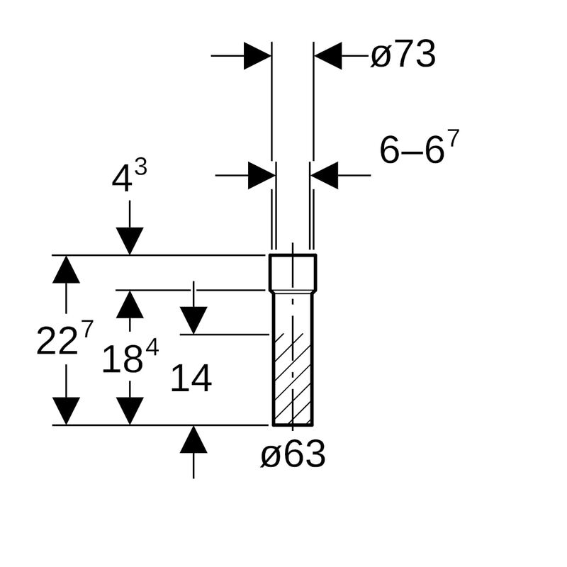 Suora Geberit PE -liitäntäyhde kutistusmuhvilla: d = 63 mm, di = 73 mm.