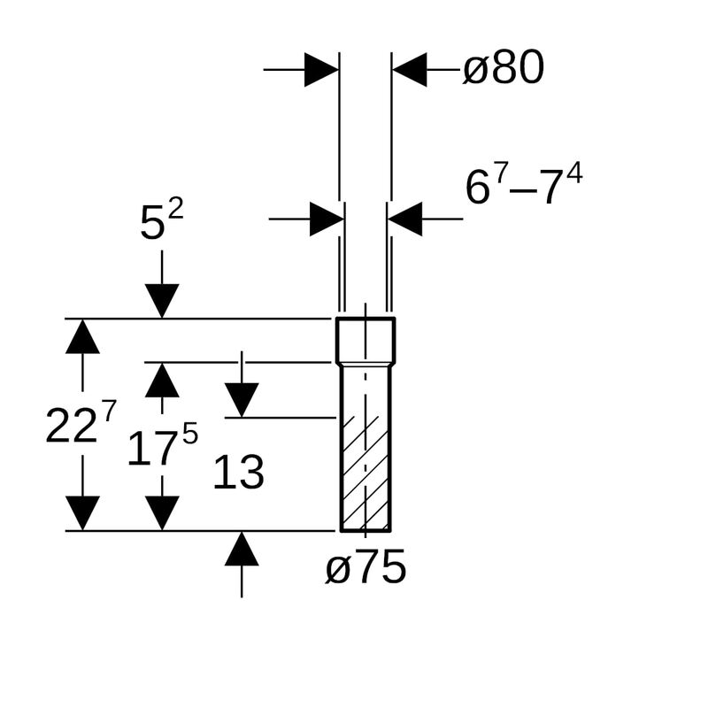 Suora Geberit PE -liitäntäyhde kutistusmuhvilla: d = 75 mm, di = 80 mm.