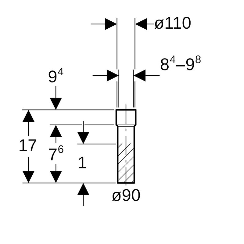 Suora Geberit PE -liitäntäyhde kutistusmuhvilla: d = 90 mm, di = 110 mm.