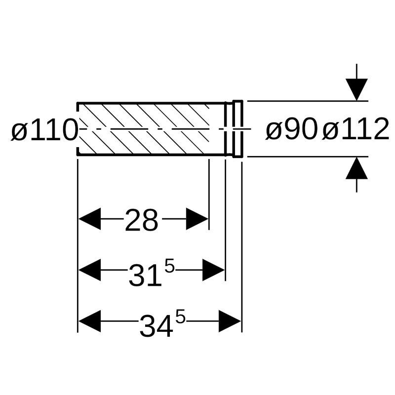 Geberit PE -liitosyhde muhvilla, seinä-WC:lle: d = 110 mm, d1 = 90 mm.