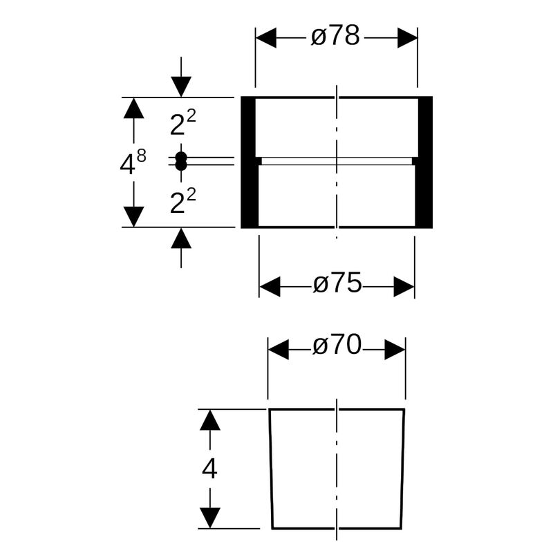 Geberit PE -muunnosyhde valurautaan, tukirenkaalla: d = 75 mm, d1 = 78 mm, di = 70 mm.