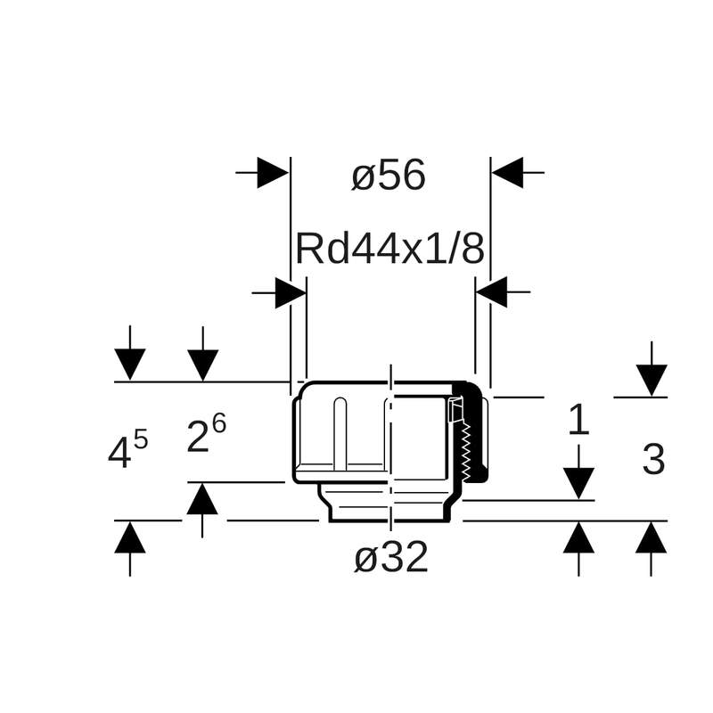 Geberit PE -päätykorkki: d = 32 mm, d = 5.6 cm, H = 4.5 cm.