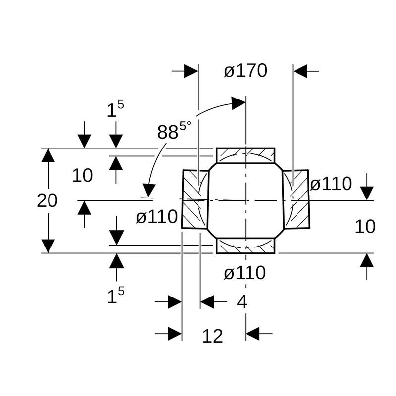 Geberit PE -kaksoispallohaarayhde 88,5°, liitännät 180° kulmassa: d = 110 mm, d1 = 110 mm.