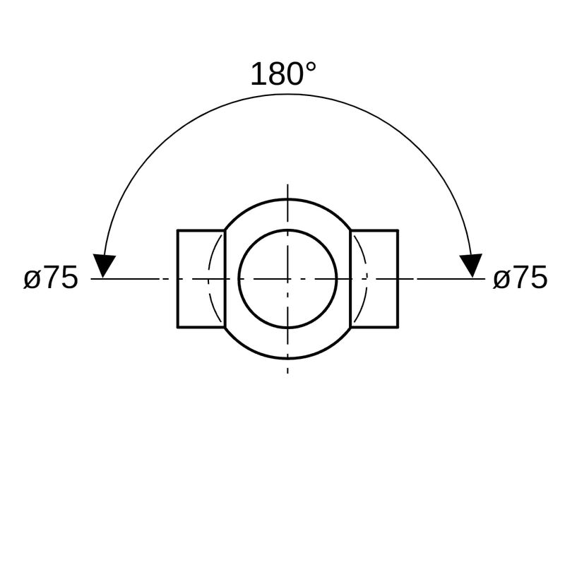 Geberit PE -kaksoispallohaarayhde 88,5°, liitännät 180° kulmassa: d = 75 mm, d1 = 75 mm.