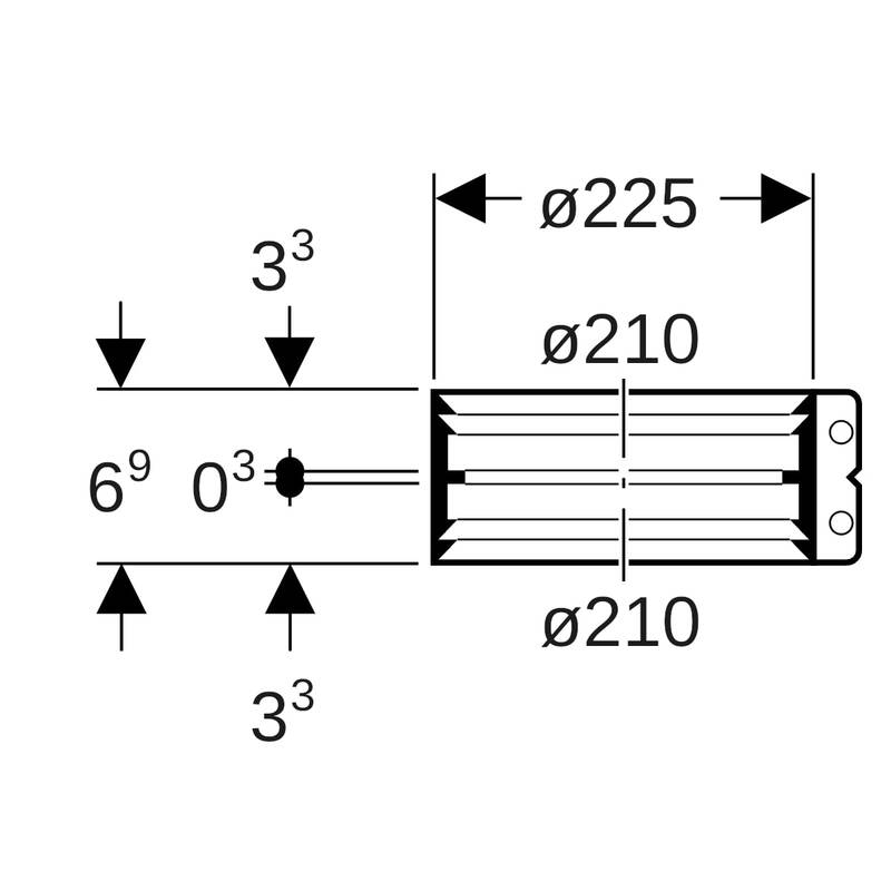 Geberit-pantaliitin: d = 210 mm, d1 = 210 mm.