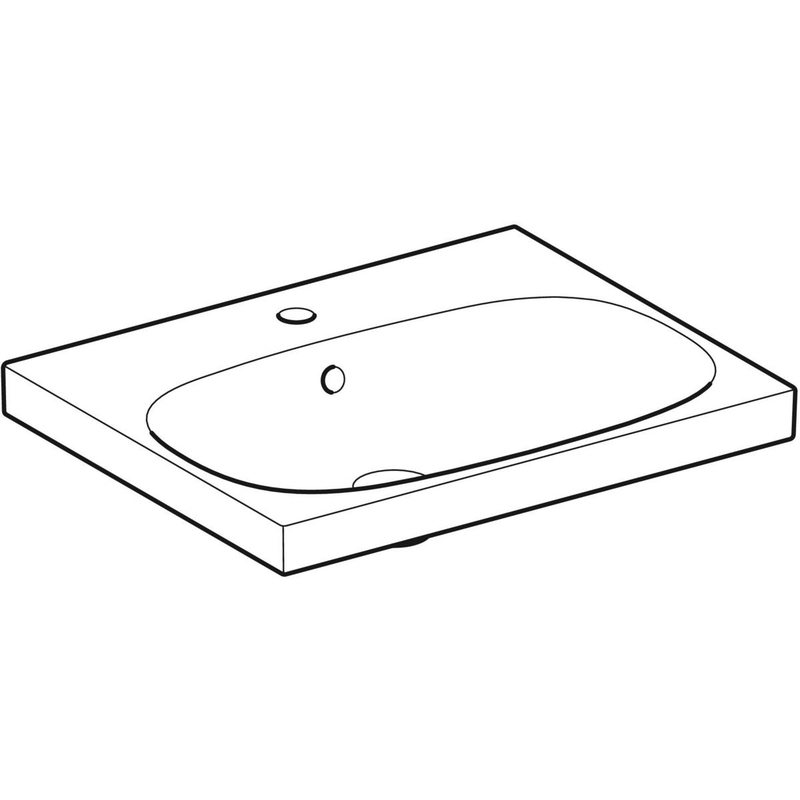 Geberit Acanto -pesuallas: B = 60 cm, T = 48.2 cm, hanareikä = keskellä, ylivuoto = näkyvä, valkoinen.