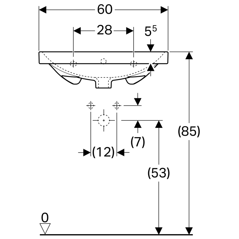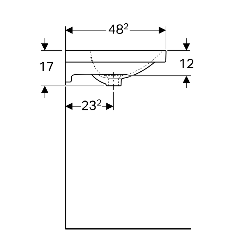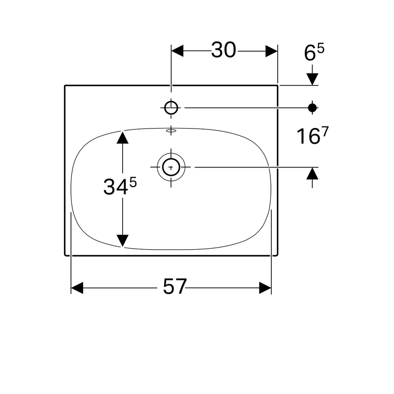 Geberit Acanto -pesuallas: B = 60 cm, T = 48.2 cm, hanareikä = keskellä, ylivuoto = näkyvä, valkoinen/ KeraTect.