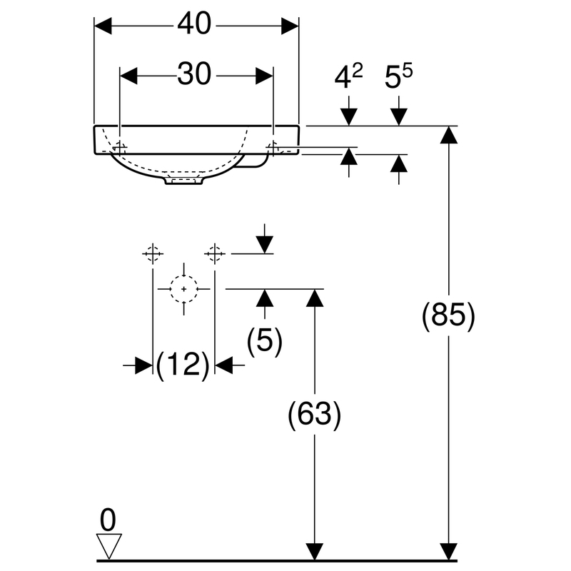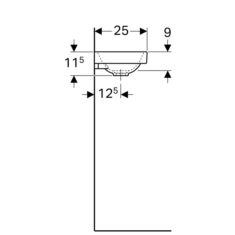 Geberit Acanto -pieni pesuallas, hanareikä oikealla: valkoinen, B = 40 cm, H = 11.5 cm, T = 25 cm, hanareikä = oikea, ylivuoto = ei ole.