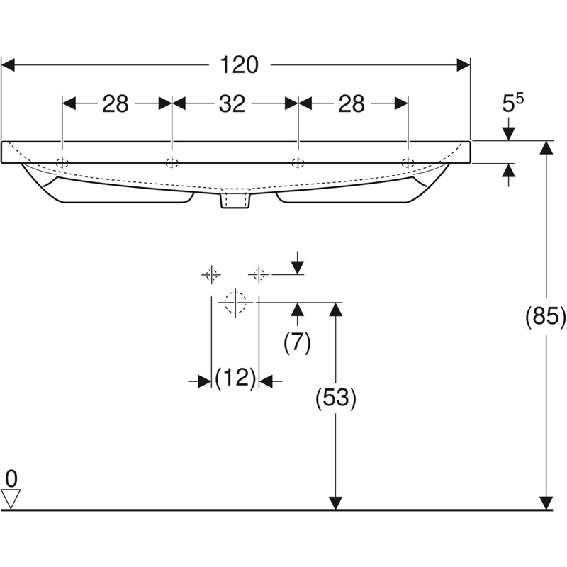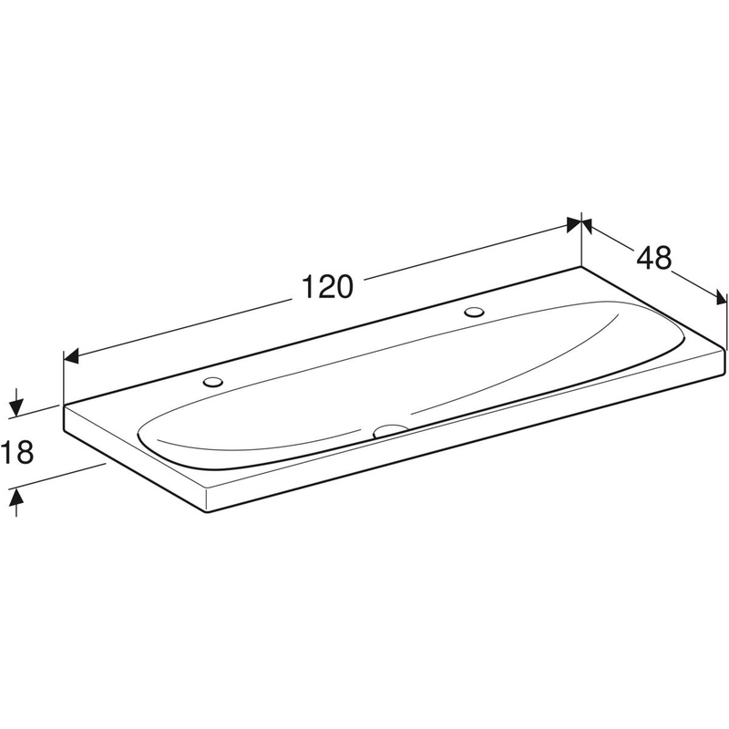 Geberit Acanto -pesuallas: B = 120 cm, T = 48.2 cm, hanareikä = vasen ja oikea, ylivuoto = ei ole, valkoinen/ KeraTect.