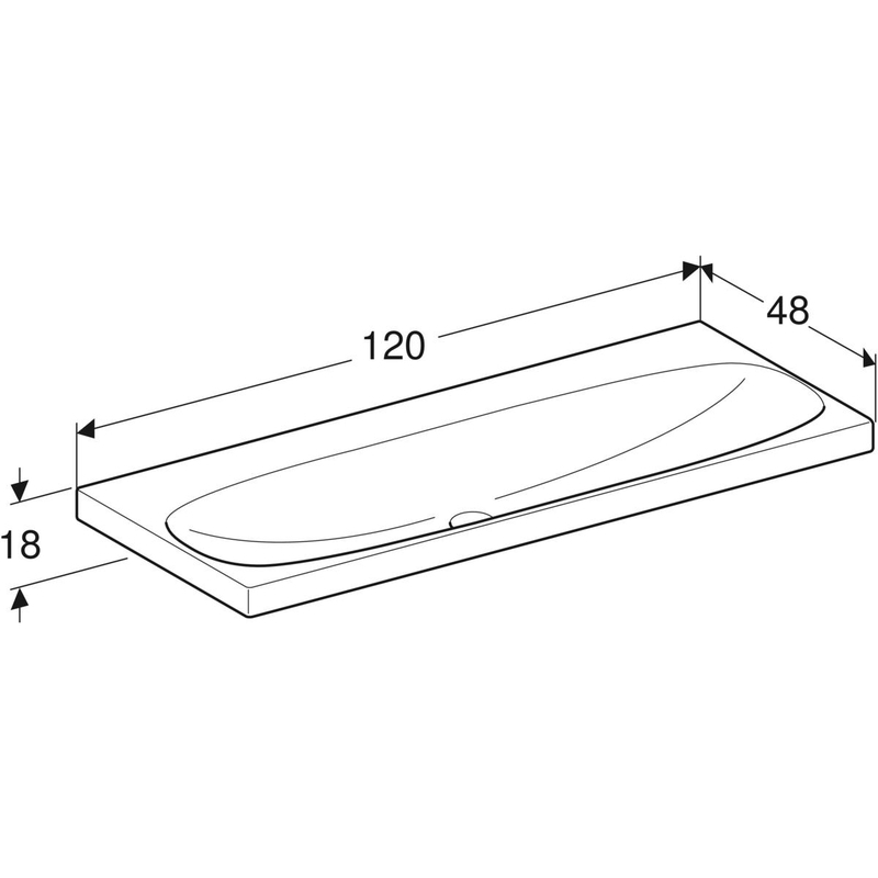 Geberit Acanto -pesuallas: B = 120 cm, T = 48.2 cm, hanareikä = ei ole, ylivuoto = ei ole, valkoinen.