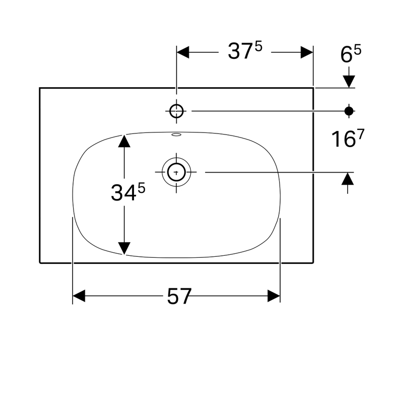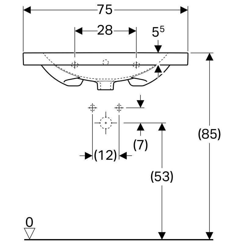 Geberit Acanto -pesuallas laskutasolla: B = 75 cm, T = 48.2 cm, hanareikä = keskellä, ylivuoto = näkyvä, valkoinen.