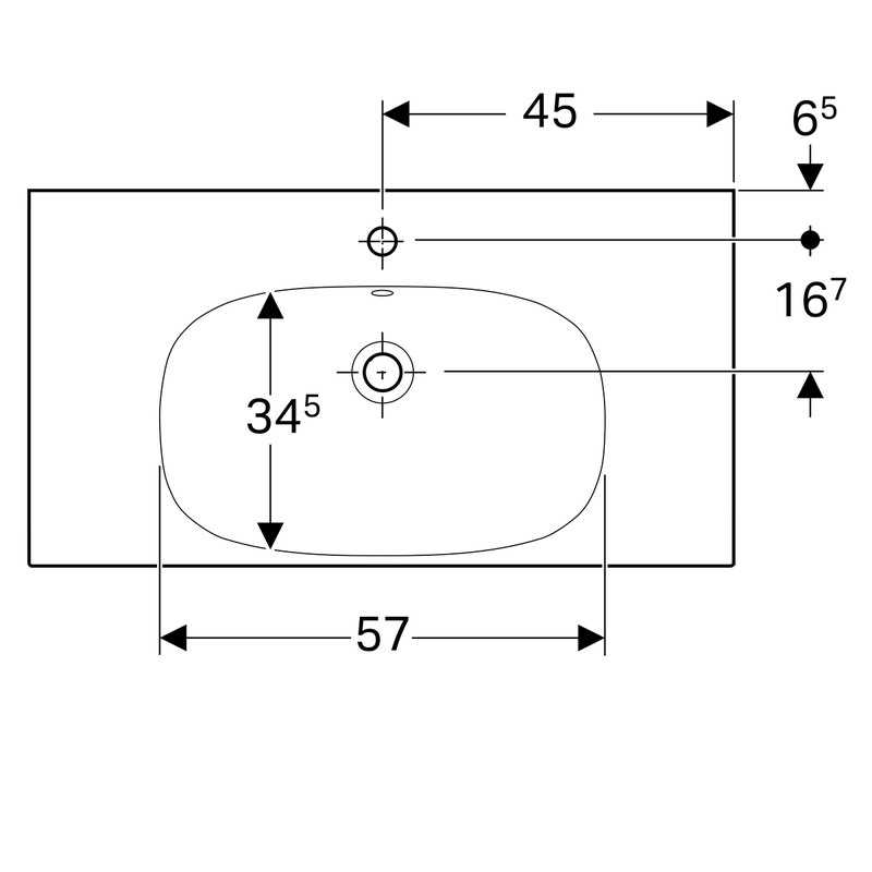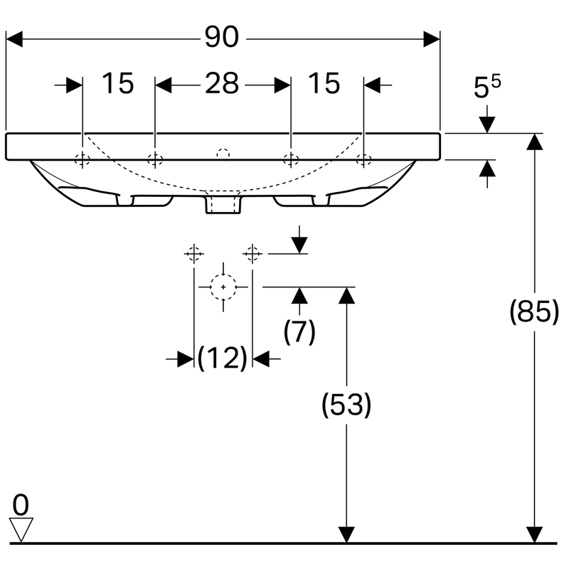 Geberit Acanto -pesuallas laskutasolla: B = 90 cm, T = 48.2 cm, hanareikä = keskellä, ylivuoto = näkyvä, valkoinen.
