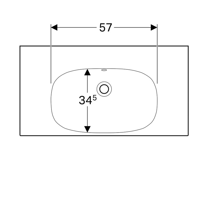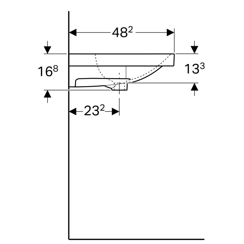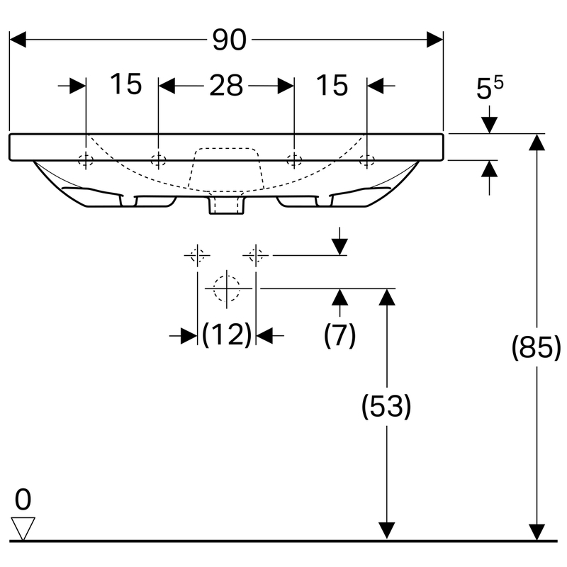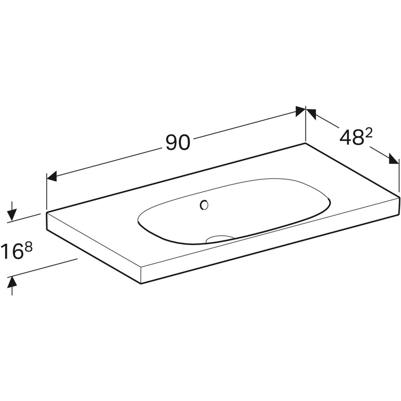 Geberit Acanto -pesuallas laskutasolla: B = 90 cm, T = 48.2 cm, hanareikä = ei ole, ylivuoto = näkyvä, valkoinen.