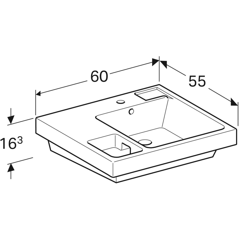Geberit Bambini -pesuallas pesusienelle tarkoitetulla sivualtaalla: B = 60 cm, H = 16.3 cm, T = 55 cm.
