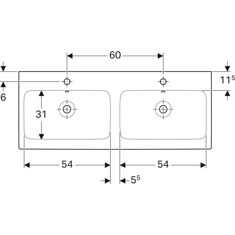 Geberit iCon -kaksoispesuallas: B = 120 cm, T = 48.5 cm, hanareikä = keskellä, ylivuoto = näkyvä, valkoinen.