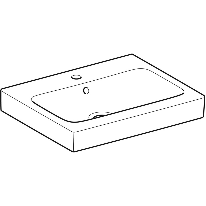 Geberit iCon -pesuallas: B = 60 cm, T = 48.5 cm, hanareikä = keskellä, ylivuoto = näkyvä, valkoinen.