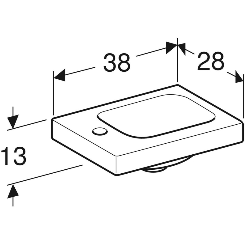 Geberit iCon Light pieni pesuallas: valkoinen, B = 38 cm, H = 13 cm, T = 28 cm, hanareikä = vasen, ylivirtaus = ei ole, laskutaso = vasen.