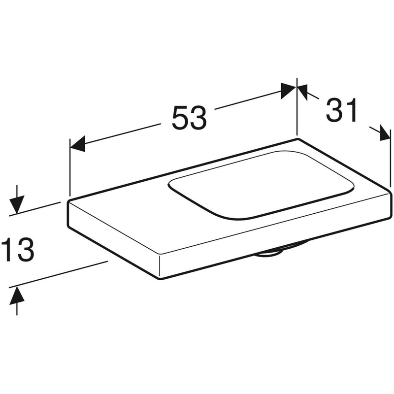 Geberit iCon Light pieni pesuallas, jossa on laskutaso: valkoinen/ KeraTect, B = 53 cm, H = 13 cm, T = 31 cm, hanareikä = ei ole, ylivirtaus = ei ole, laskutaso = vasen.