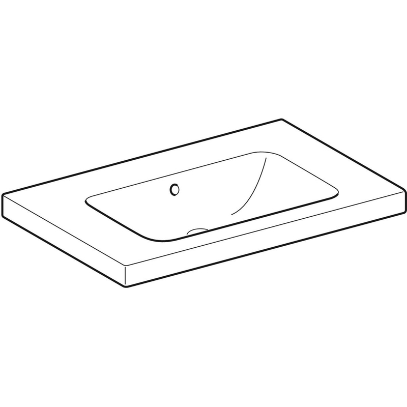 Geberit iCon Light -pesuallas laskutasolla: B = 75 cm, T = 48 cm, hanareikä = ei ole, ylivirtaus = näkyvä, valkoinen.