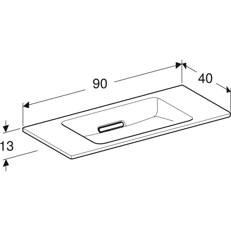 Geberit ONE -pesuallas, leijuva malli, vaakaviemäri, Compact: B = 90 cm, T = 40 cm, hanareikä = ei ole, ylivuoto = ei ole. Pesuallas valkoinen/KeraTect, viemäröinnin kansi kromattu.