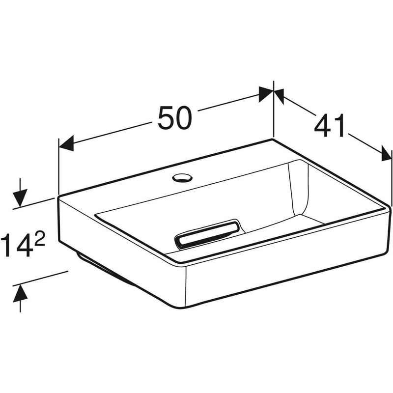 Geberit ONE -tason päälle asennettava pesuallas, suorakulmainen, vaakapoisto: B = 50 cm, T = 41 cm, hanareikä = keskellä, ylivuoto = ei ole, valkoinen matta, kiiltävä valkoinen.