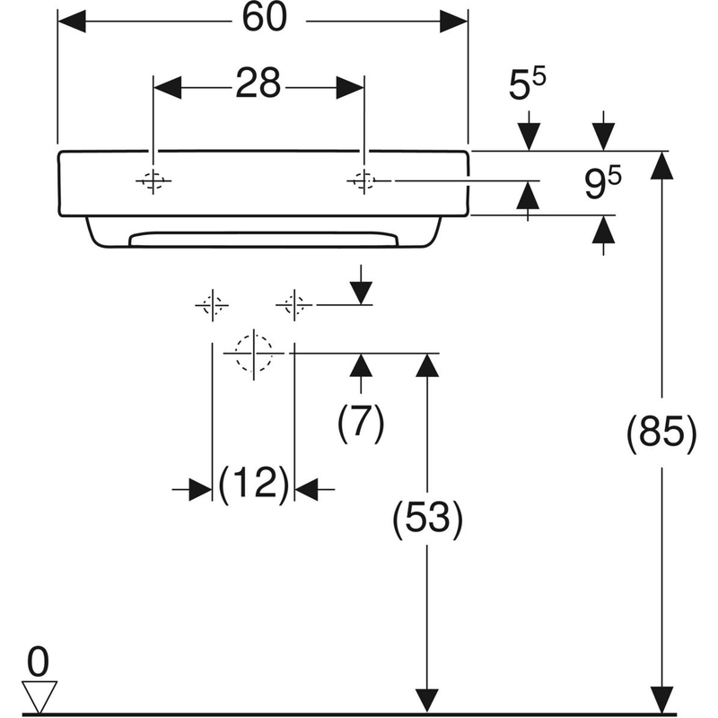 Geberit ONE -pesuallas, vaakapoisto: B = 60 cm, T = 48 cm, hanareikä = keskellä, ylivuoto = ei ole, valkoinen/ KeraTect, kiiltävä valkoinen.