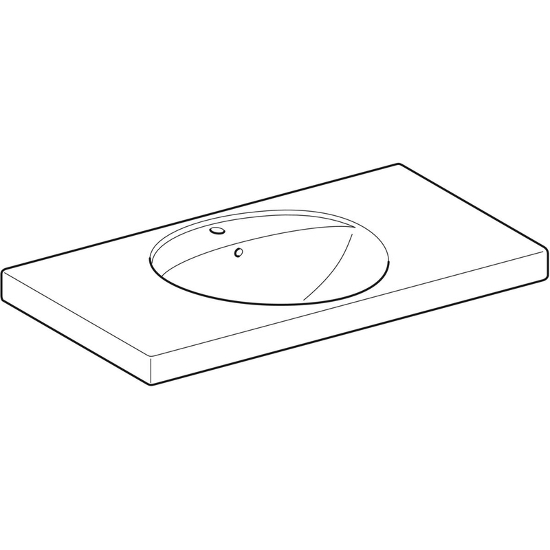 Geberit Preciosa -pesuallas laskutasolla: B = 100 cm, T = 55 cm, hanareikä = keskellä, ylivuoto = näkyvä, valkoinen.
