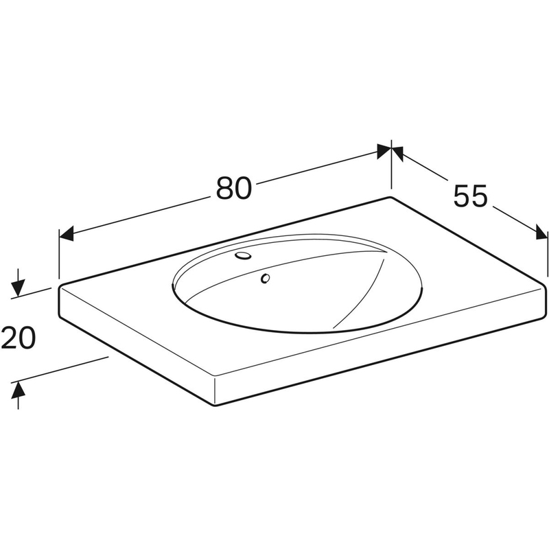 Geberit Preciosa -pesuallas laskutasolla: B = 80 cm, T = 55 cm, hanareikä = keskellä, ylivuoto = näkyvä, valkoinen.