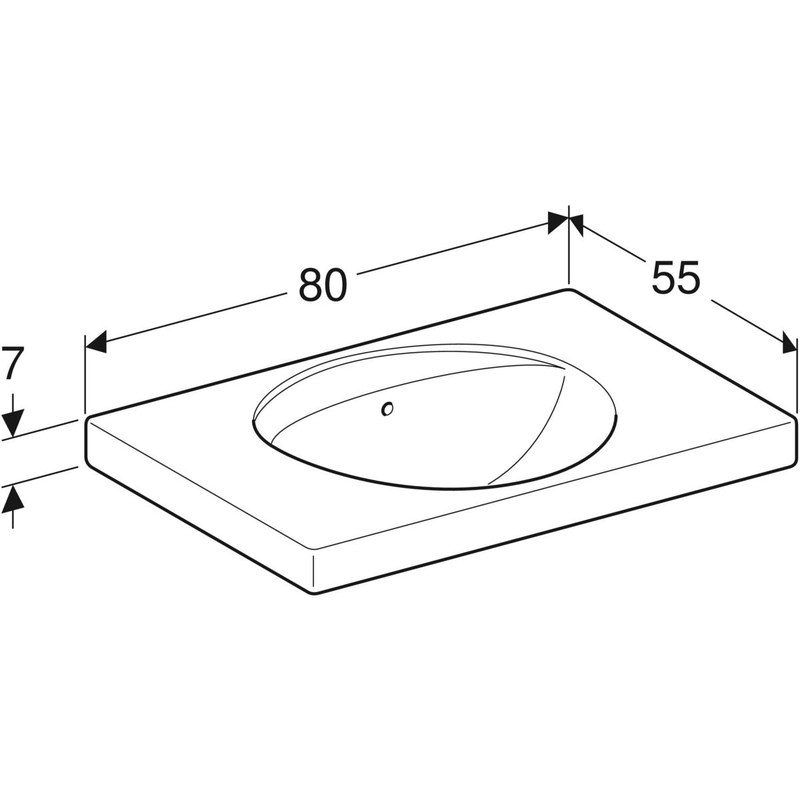 Geberit Preciosa -pesuallas laskutasolla: B = 80 cm, T = 55 cm, hanareikä = ei ole, ylivuoto = näkyvä, valkoinen.