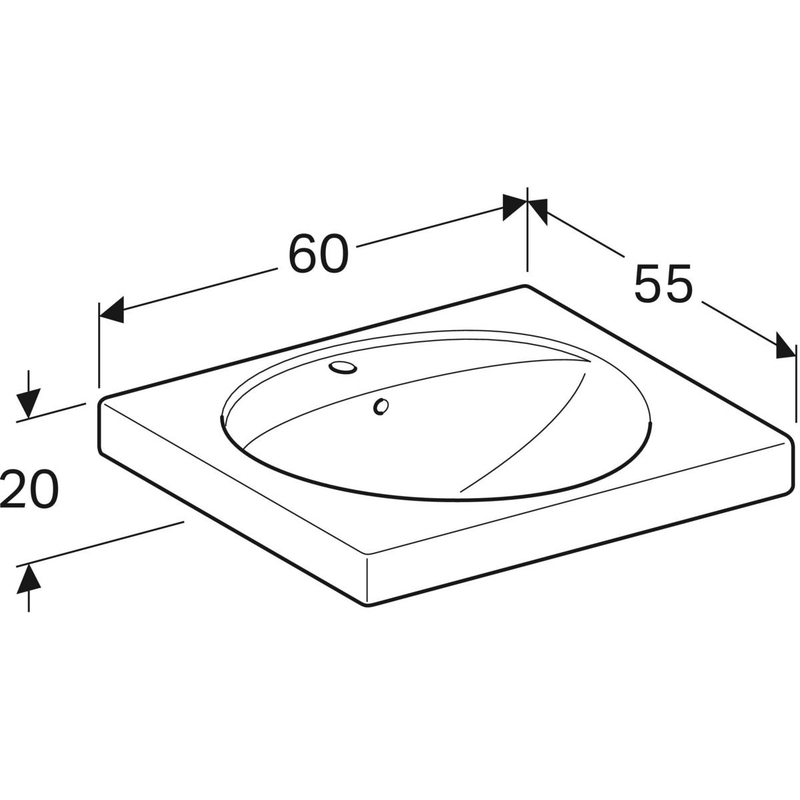 Geberit Preciosa -pesuallas laskutasolla: B = 60 cm, T = 55 cm, hanareikä = keskellä, ylivuoto = näkyvä, valkoinen/ KeraTect.