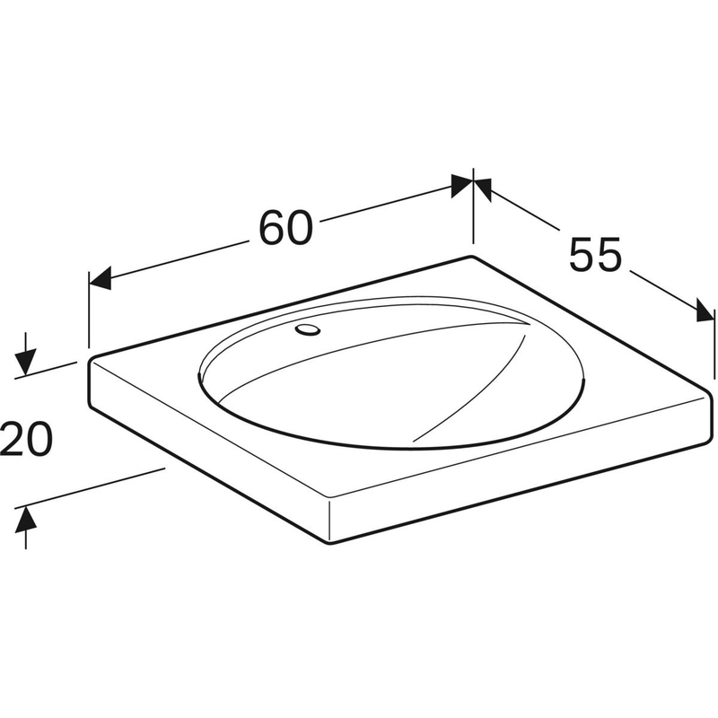 Geberit Preciosa -pesuallas laskutasolla: B = 60 cm, T = 55 cm, hanareikä = keskellä, ylivuoto = ei ole, valkoinen/ KeraTect.