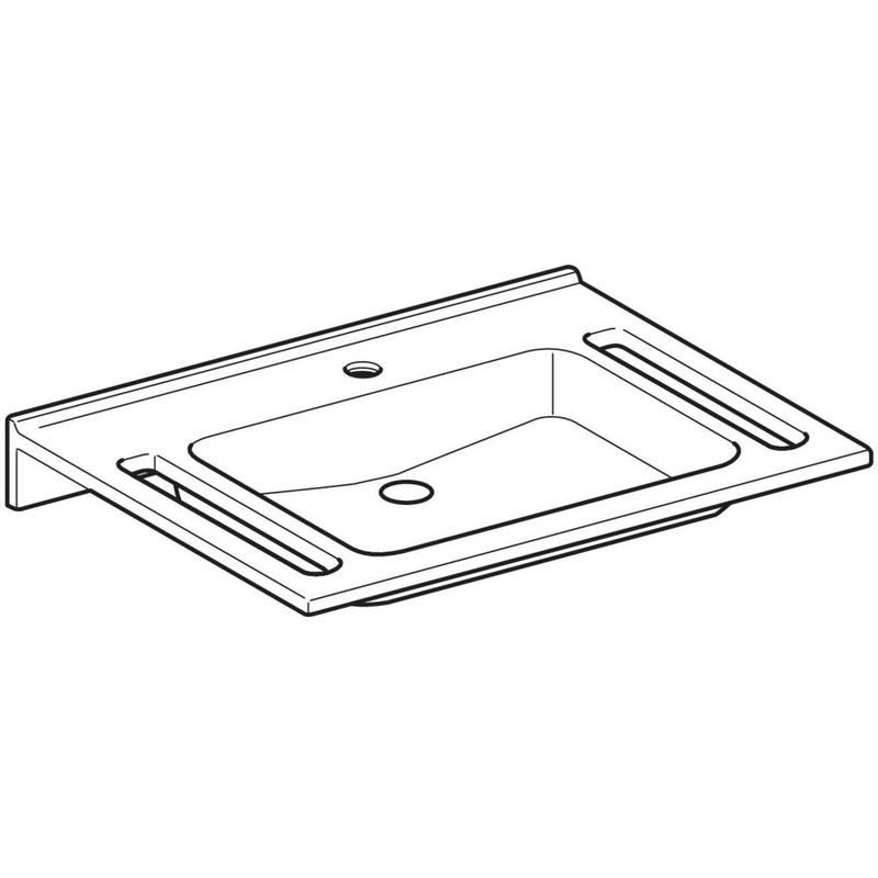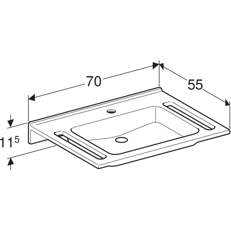 Geberit Publica -pesuallas, kulmikas malli, aukoilla, esteetön: B = 70 cm, T = 55 cm, hanareikä = keskellä, ylivuoto = ei ole, valkoinen (Alpine).